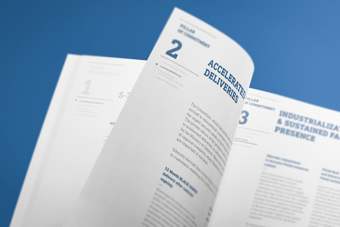 Polish Aviation Works in Mielec is a key production facility in the Polish aerospace and defense industry. Thanks to the support of over 50 Polish suppliers, BLACK HAWK S70i helicopters, as well as cabins, tail cones and pylons are produced in Mielec for the entire BLACK HAWK helicopter family. Additionally, the facility carries out test flights and modifications of helicopter specifications in accordance with the requirements of clients from all over the world. Our task was to design a catalog that would present the participation of the Polish defense industry and Polish technologies in the construction of these legendary machines. The catalog was created for the purposes of PZL Mielec offer in a strategic tender for the supply of 70 multi-task helicopters for the Polish Army.